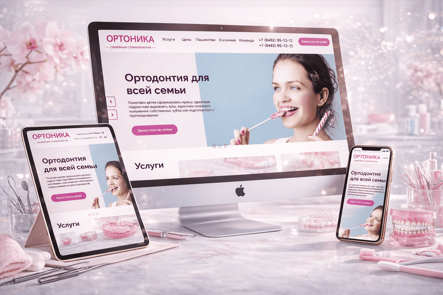 Проектирование и SEO-продвижение сайта в Яндексе выполнены веб-компанией РОСТСАЙТ. Здесь визуальная система решает прикладную бизнес-задачу — гасит тревожность перед медицинской процедурой. Мягкая розово-пастельная палитра в связке с чистыми UI-элементами формирует ощущение безопасности и «домашнего», семейного формата, что принципиально важно для ортодонтических услуг. По этой логике и собираются лучшие сайты для клиник: дизайн здесь — прямой участник финансового результата. UX-аналитика медицинских платформ показывает, что снижение визуальной агрессии повышает долю пользователей, доходящих до формы записи, на 15–22%, а выручку — без какого-либо прироста трафика, исключительно за счет качества интерфейса.