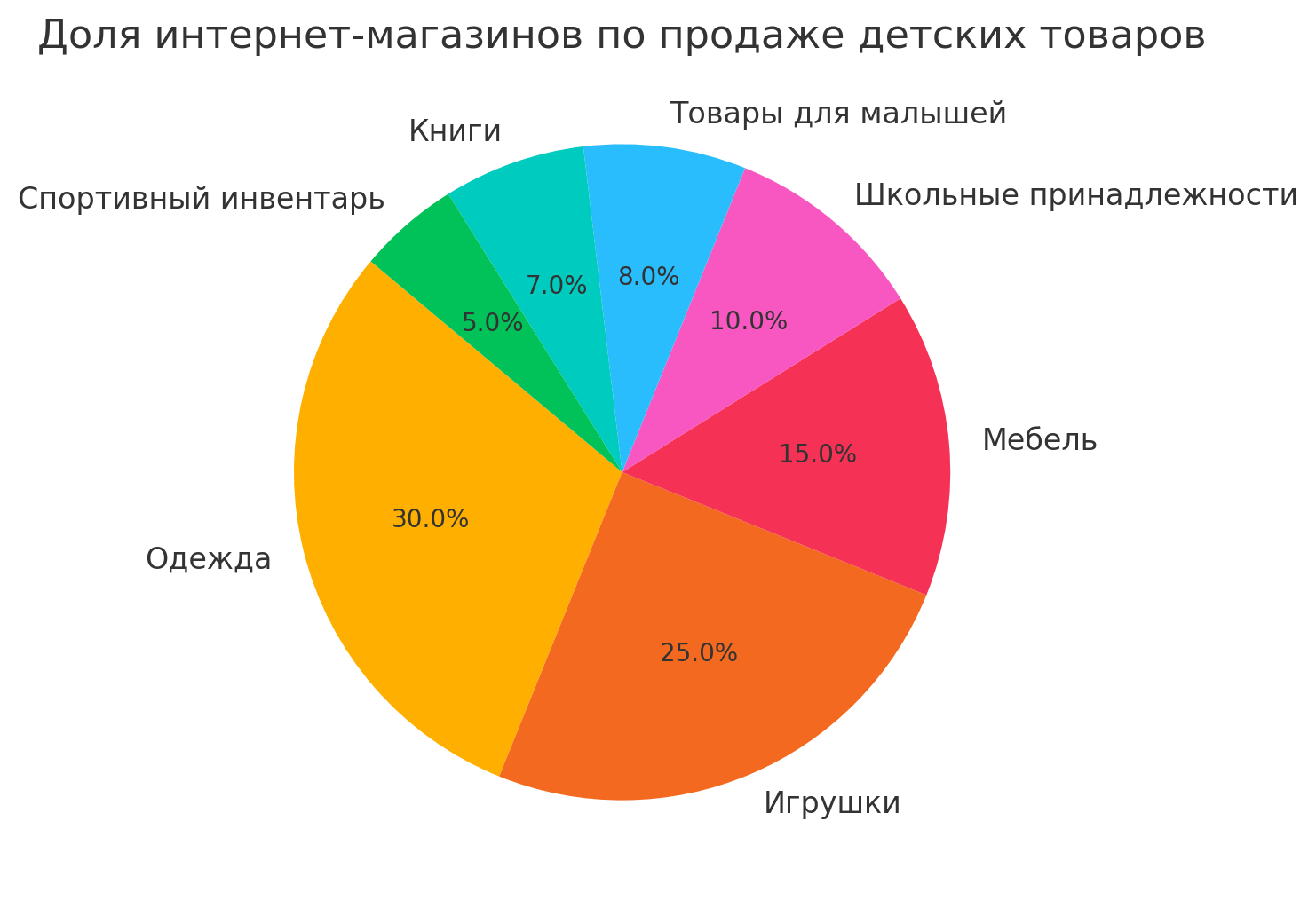 Эта диаграмма показывает долю интернет-магазинов по продаже детских вещей в Интернете. Больше всего сайты торгуют детской одеждой (30%), игрушками (25%) и мебелью (15%). На четвертом месте – онлайн-продавцы школьных принадлежностей (10%). Далее идут сайты с товарами для малышей (8%), книгами (7%) и спортивным инвентарем (5%).