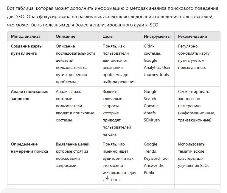Эти дополнительные идеи помогают выйти за пределы традиционных методов исследования аудитории и дают более полное представление о том, как можно анализировать и оптимизировать поисковое поведение для достижения лучших результатов SEO-продвижения сайта.